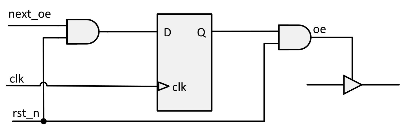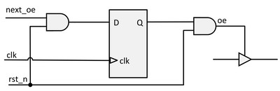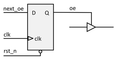 Требование к наличию тактового сигнала для осуществления сброса, является существенным, если ASIC/FPGA имеет внутреннюю tristate шину. Чтобы предотвратить конфликт на внутренней шине tristate при включении микросхемы, микросхема должна иметь асинхронный сброс питания (см. рис. 5). Можно использовать синхронный сброс, однако вы должны напрямую перевести сигнал разрешения tristate (сигнал ое) в неактивное состояние с помощью сигнала сброса (см. рис. 6). Этот синхронный метод имеет преимущество при более простом временном анализе для пути reset-to-HiZ.