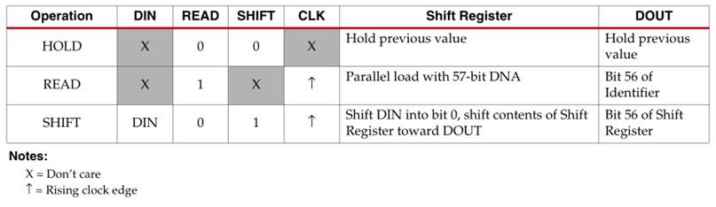 Для того чтобы выполнить считывание DNA кристалла, необходимо выставить значение READ в «1» на один такт CLK, после чего DNA будет передан во временный сдвиговый регистр, который доступен для считывания пользователю. Для выполнения операции сдвига в сдвиговом регистре необходимо управлять входом SHIFT. Ниже приведена таблица с операциями, доступными для модуля DNA_PORT.