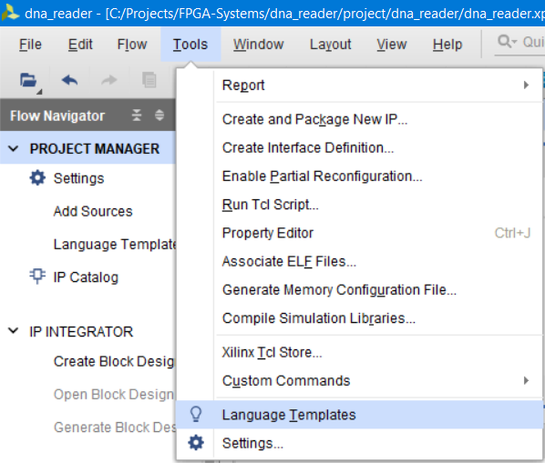 Для добавления в код экземпляра модуля необходимо воспользоваться шаблонами для вставки, которые можно найти либо в [2], либо в подборке языковых шаблонов (Language Templates) Vivado: