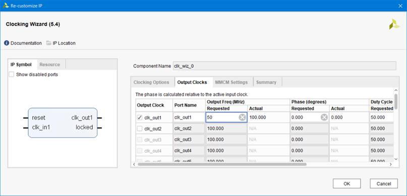 3. Устанавливаем выходную тактовую частоту во вкладке Output Clocks: clk_out1– 50МГц.