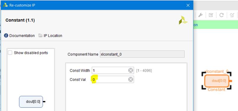 Поскольку мы реализуем включение по схеме с рисунка 5, необходимо добавить IP блок Constant и установить его значение в «0»: