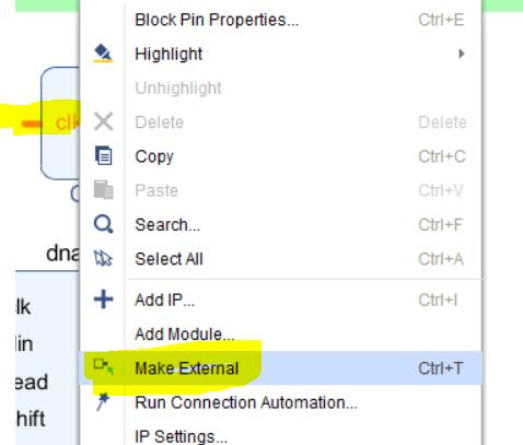 Выполним подключение внешних выводов и соединение блоков. Сделаем вход clk_in1 модуля clk_wiz_0 внешним: