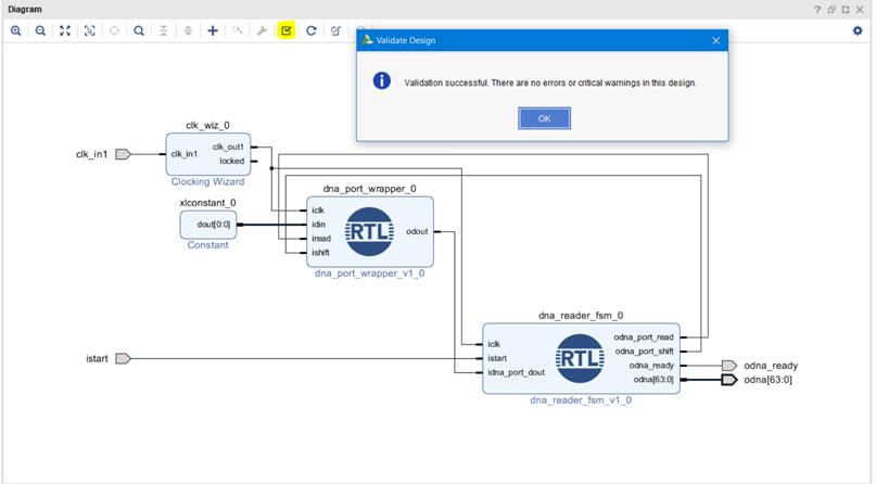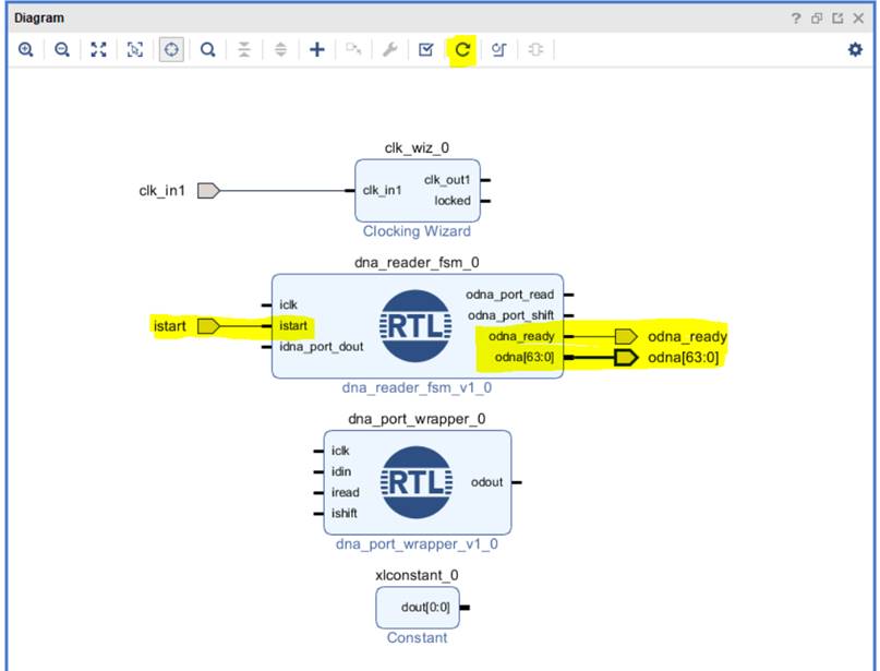 Выполните аналогичные шаги для выводов istart, odna_ready и odna[63:0] модуля dna_reader_fsm_0, чтобы получился результат, как на рисунке 23 (для оптимизации рабочего пространства нажмите кнопку Regenerate Layout, доступную на панели инструментов):