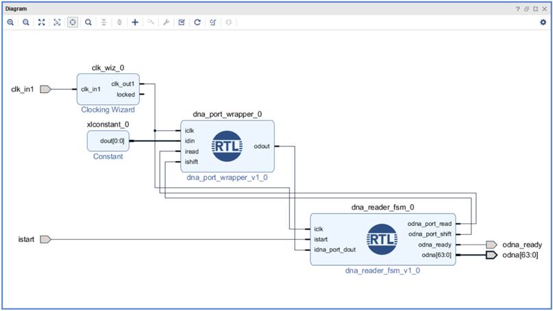 В этой статье рассмотрен аппаратный блок DNA_PORT ПЛИС Xilinx, который хранит уникальный номер FPGA, способный помочь Вам защитить Ваши проекты от копирования и вести учёт версий и отдельных копий прошивки. Использованный демонстрационный проект собран с помощью IP Integrator, который, начиная с версии Vivado 2017.1, поддерживает схемотехническое соединение модулей, написанных на SystemVerilog, Verilog и VHDL. Приведены полное описание модуля DNA_PORT, пошаговая инструкция по сборке проекта, результаты его поведенческого моделирования и аппаратной проверки, выполненной с помощью Logic Analyzer.
