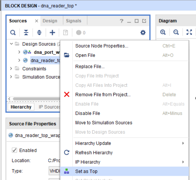 Теперь пометим модуль dna_reader_top_wrapper в качестве модуля верхнего уровня – сделаем его собственно «топовым». Для этого кликаем по нему правой кнопкой мыши и выбираем Set as Top: