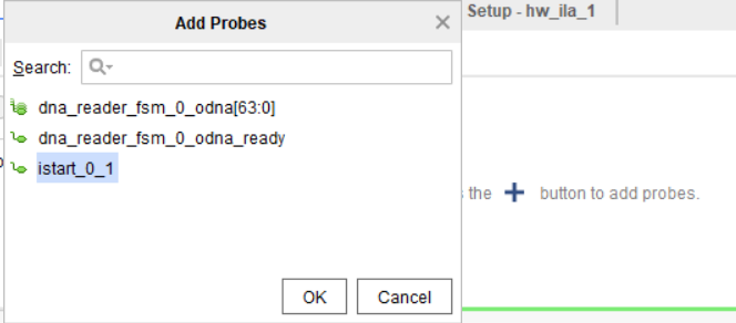Для добавления условия срабатывания (т.е. триггера условия), нажмите на крестик в окне Trigger Setup, и выберите сигнал istart, затем нажмите ОК.