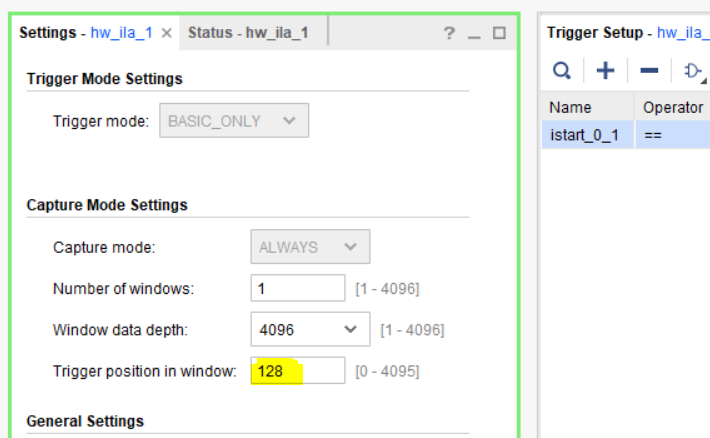 2. Настройте триггер логического анализатора на сигнал odna_ready за 1234 отсчёта до его срабатывания. (Учтите, что для перезапуска потребуется заново прошить FPGA, поскольку автомат управления не имеет условия возврата к начальному состоянию, из которого происходит его запуск по istart).