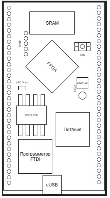 - Утвердили, что мезонинный модуль должен быть полностью автономным и должен содержать базовые компоненты: ПЛИС, программатор (как опция), модуль питания, ПЗУ, ОЗУ в виде статической/динамической памяти, кнопка, светодиод. Вся остальная периферия будет подключаться к несущей через PMOD и другие «устоявшиеся» коннекторы. Вариант совместимости с платами Raspberry, Terrasic, Arduino в процессе обсуждения.
