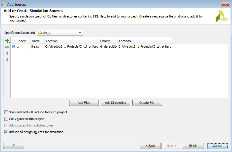 4) Добавляем file.sv в пустой проект в Vivado(File->Add source->Add or create simulation sources->Add, убираем галочку с Copy sources into project, Finish)