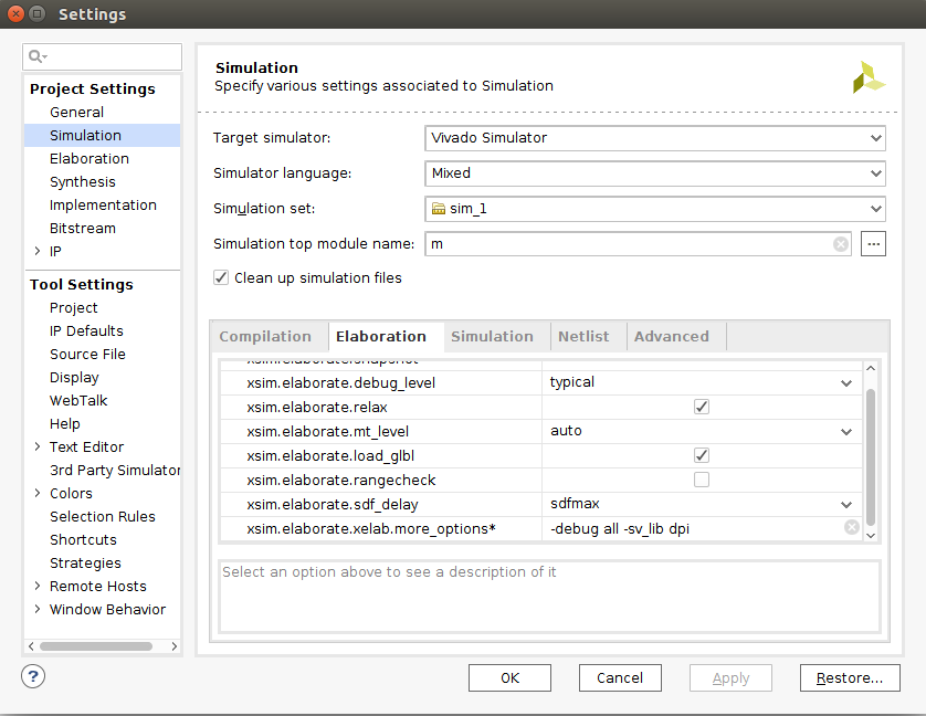 Во вкладке Elaboration в поле xsim.elaborate.xelab.more_options прописываем: “-debug all -sv_lib dpi” – подключение библиотек dpi и включение режима отладки поддерживающего просмотр вэйвформ.