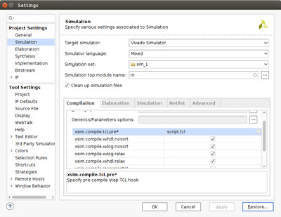 Открывает настройки проекта (Tools -> Settings -> Simulation->Compilation) и в настройках симуляции есть поле xsim.compile.tcl.pre в него добавляем ссылку на script.tcl – таким образом без лишних манипуляций со стороны разработчика .so библиотека будет подлинковываться при нажатии на кнопку симуляции.