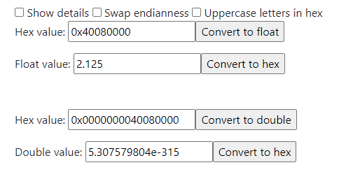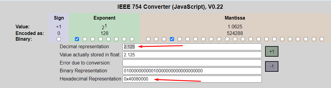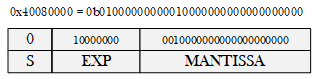 Битовая строка для формата IEEE-754 состоит из трех полей: поле знака, поле экспоненты, поле мантиссы [если будет интерес к тому почему для стандарта выбрали именно такие поля и какой в них математический смысл - пишите, обсудим это в последующих заметках]. Например число записанное в виде 0x40080000, ничто иное как число 2,125. [ссылка на конвертер]