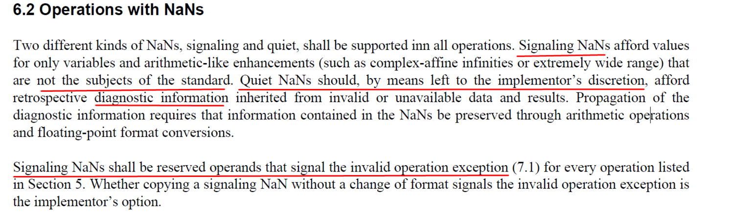 В далеком 1985-м году, когда был утвержден первый стандарт представления чисел с плавающей точкой для ЭВМ, в нем было введены операции с NaN. NaN, в свою очередь, разделяются на 2 подмножества: qNaN [тихие NaN] и sNaN [сигнальные NaN]. В чем же различие между ними? Давайте обратимся к стандарту 1985-го года.