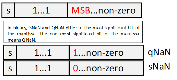 Мы разобрались с идеей представление NaN в формате IEEE-754. Может возникнуть вопрос, а как же различить qNaN и sNaN? Ответ - старшим битом мантиссы. Для qNaN, он равен 1, для sNaN - 0.