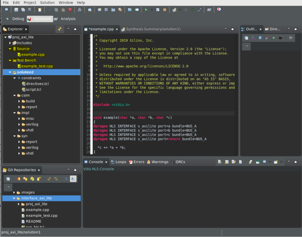 Example.cpp – Код который будет синтезирован в RTL для дальнейшего создания нашего IP блока. Данный IP будет скомбинирован с другим IP блоком в Vivado Design Suite и в конечном счете размещен в вашем устройстве.