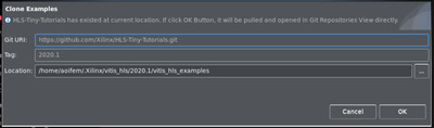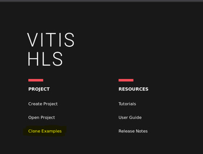 1. Открыть Vitis HLS GUI. Из появившегося окна, выбрать ‘Clone Examples’ что бы скопировать проект с примером для Vitis HLS из GitHub: