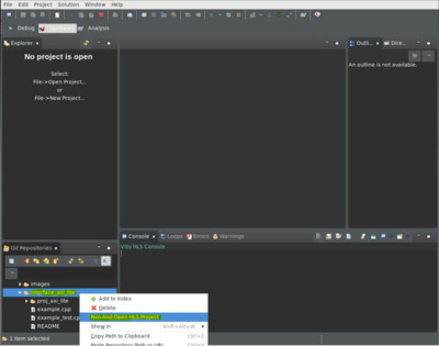 3. В следующем окне, проект с примером будет отображён в нижнем левом углу. Нужно раскрыть стрелку под ‘HLS Tiny Tutorials’ и ‘Working Tree’ что бы посмотреть структуру данного проекта.