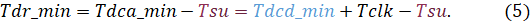 В предыдущем уравнении учитывается, что данные должны прийти на время Tsu раньше защелкивающего фронта. Таким образом, чтобы выполнялось требование на максимальное время распространения (Setup), данные должны дойти до конца пути не позднее времени Tdr.
