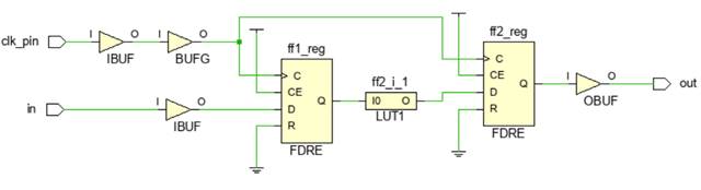 Рассмотрим самый простой пример проекта, который состоит из двух триггеров между которыми расположен LUT, реализующий логическое отрицание. Схема проекта показана на рисунке 3. Описание на SystemVerilog представлено ниже: