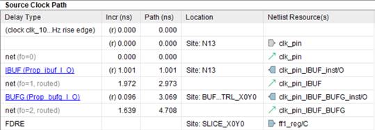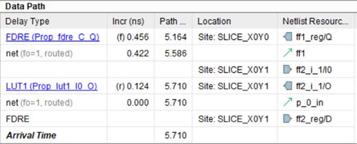 В разделе, представленном на рисунке 7, указаны задержки при распространении данных, которые состоят из задержки clock to output (Tco) для триггера FF1, задержки распространения через nets и LUT (Tilo). Просуммировав значения в столбце Incr, получим 1.002 нс, что совпадает со значением Data Path Delay на рисунке 5.