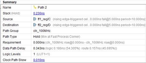 Важно заметить, что задержка через одни и те же элементы при анализе по Setup и Hold имеют разные значения. Например, задержка через LUT для Setup равна 0.124 нс., а для Hold – 0.045 нс. Значение, представленное в datasheet DS181 для speedgrade -1, равно 0.1 нс.