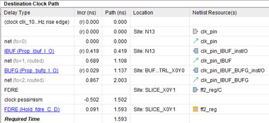 Далее после строки с надписью FDRE показаны еще три задержки, которые представляют из себя время установки Tsu для триггера FF2 (0.029 нс), а также пессимизм Tcp (Clock Pessimism, 0.336 нс.) и неопределенность Tcu (Clock Uncertainty, -0.035 нс.) тактового сигнала. О последних двух задержках будет рассказано далее в статье в пунктах 7 и 8.