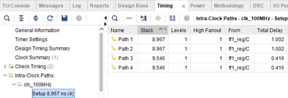 Увидеть пути, для которых проведен временной анализ, можно, если после размещения и трассировки открыть отчет Timing Summary на вкладке Intra-Clock Path / clk_100MHz (рисунок 4).
