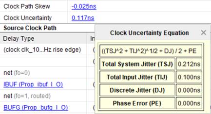 Слагаемое Tcu (Clock Uncertainty), которое встречалось при рассмотрении анализа по Setup, учитывает неопределенность тактового сигнала из-за джиттера. Нажав на значение Clock Uncertainty(рисунок 5), можно увидеть способ вычисления неопределенности (рисунке 13).