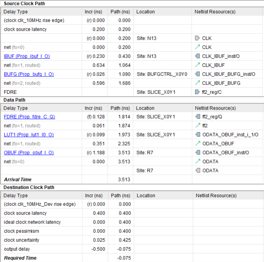 Данная команда объявляет тактовый сигнал clk_10MHz с периодом 100 нс, который поступает в FPGA через ножку CLK. Объединим все оставшиеся неизвестные слагаемые из уравнения (1) в одну переменную output_delay_max. Тогда выражение для Slack можно переписать в виде: