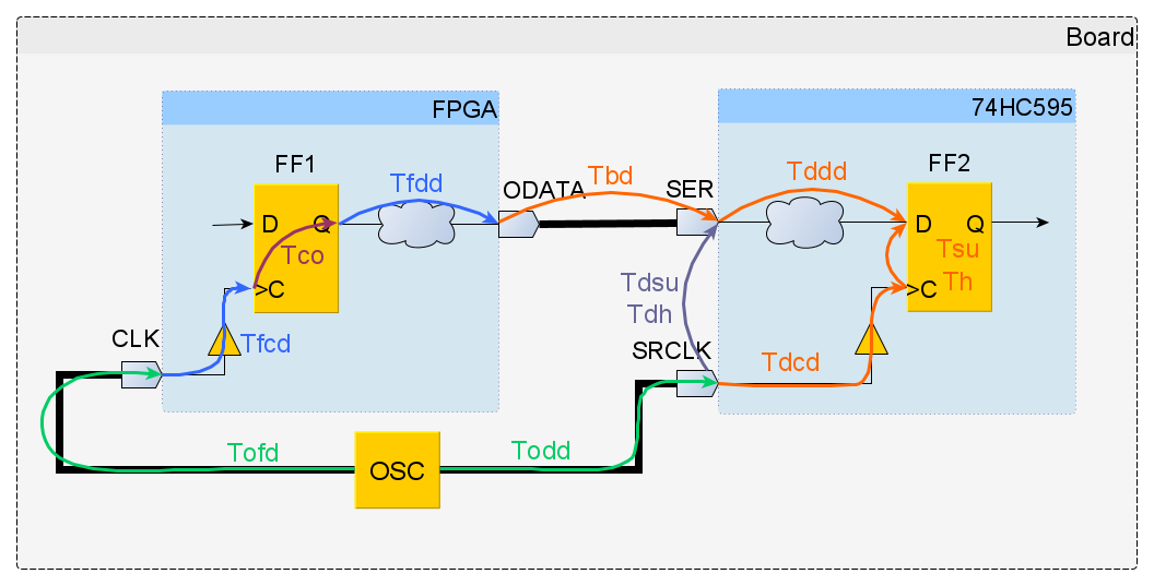 • Tbd (Board Delay) – задержка распространения данных по дорожкам платы между FPGA и микросхемой 74HC595;