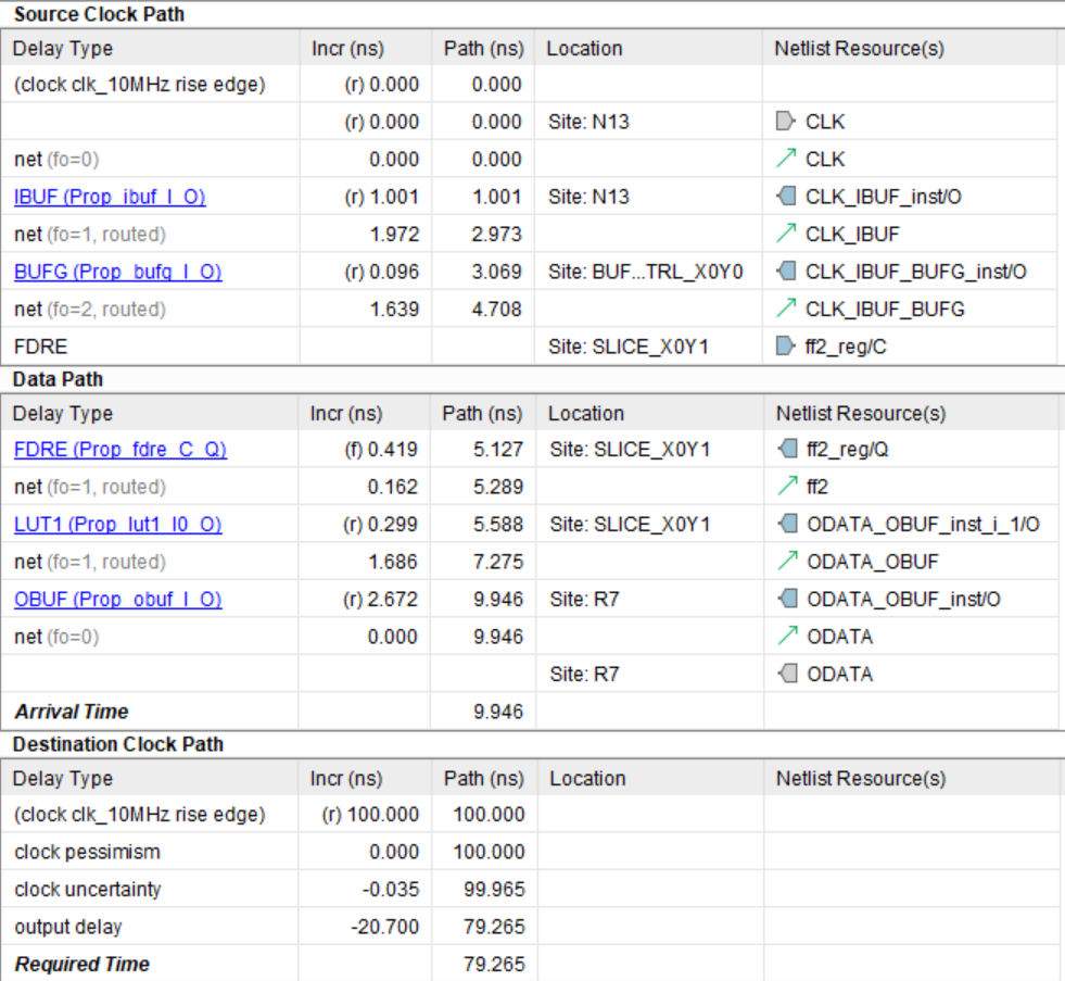 Таким образом, с учетом неопределенности тактового сигнала в 0.035 нс данные должны дойти до ножки ODATA в момент времени 100 - 20.7 - 0.035 = 79.265 нс. Отсюда получаем, что Slack равен 79.265 - 9.946 = 69.319 нс, что соответствует значению, представленному на рисунке 4.