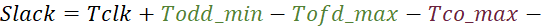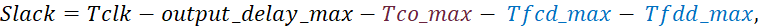 Если Slack принимает отрицательное значение, то это указывает, что данные приходят на вход защелкивающего триггера позже, чем требуется. То есть, ограничение по Setup нарушено. Используя полученные ранее уравнения, можно записать полное выражение для расчета Slack: