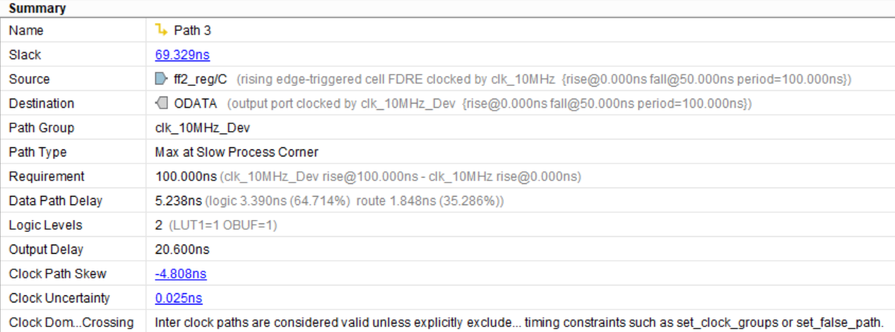 В заключении отметим следующий интересный момент. Можно увидеть, что значения Slack, представленные на рисунках 4 и 7, отличаются и равны 69.319 нс и 69.329 нс соответственно. Разница в 0.01 нс возникает из-за разной величины неопределенности тактового сигнала. Более подробно о причине такого несоответствия можно прочитать в [1].