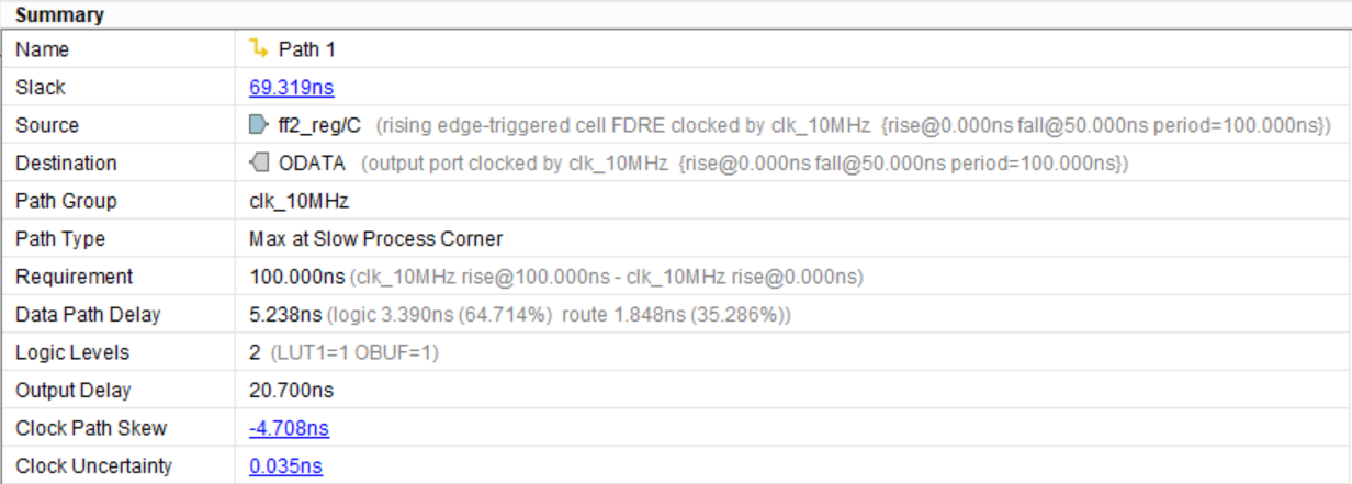 Рассмотрим, как введенные ограничения будут отражены во временных отчетах, полученных после размещения и трассировки проекта. На рисунке 4 представлен раздел Summary для анализа по Setup, в котором указан запускающий триггер (ff2_reg), выходной порт FPGA (ножка ODATA), задержка данных внутри FPGA (Data Path Delay) и количество уровней логики (Logic Levels). Также можно увидеть полученный Slack, расфазировку (Clock Path Skew) и неопределенность (Clock Uncertainty) тактового сигнала.