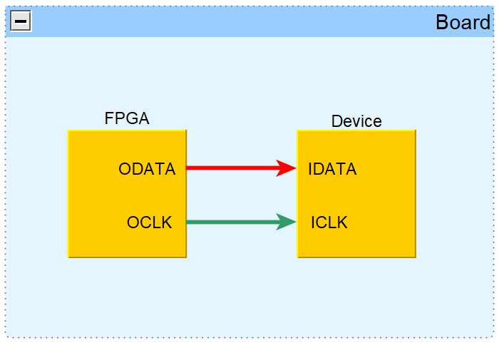В текущей статье будет рассмотрен другой способ, называемый Source Synchronous, при котором источник помимо данных также формирует тактовый сигнал (см. рисунок 2). В дальнейшем для краткости устройство, в которое из FPGA передаются данные и тактовый сигнал, будем иногда называть Device.