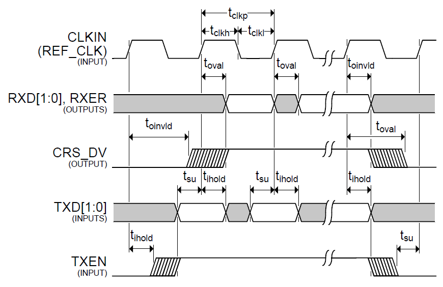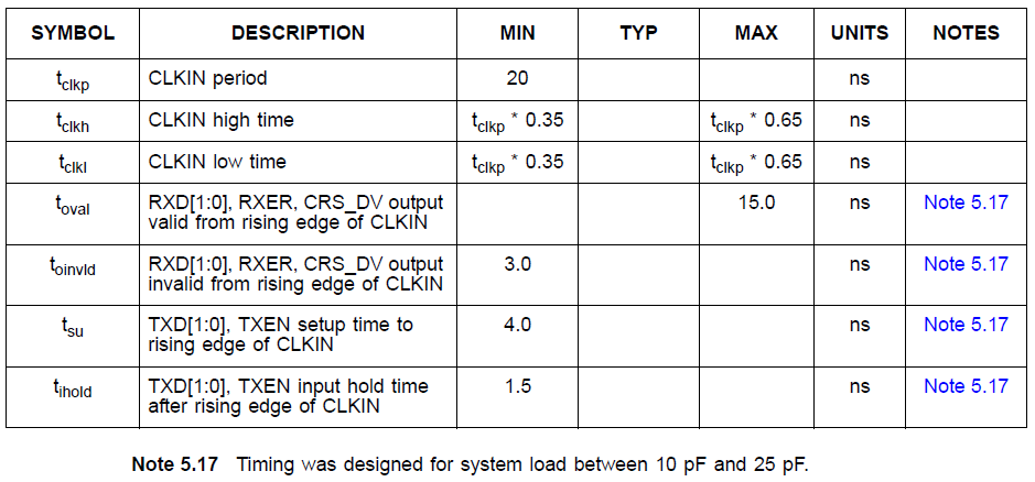 В качестве практического примера рассмотрим передачу данных по RMII из FPGA в микросхему Ethernet PHY LAN8740A [3]. На рисунке 4 приведены таблица со значениями задержек и временная диаграмма сигналов из datasheet на LAN8740A. Для краткости ограничения будут продемонстрированы для одного выходного сигнала FPGA, который подключен к ножке TXD[0] микросхемы LAN8740A.
