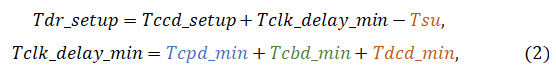 Рассмотрим второй вариант, при котором данные запускаются и защелкиваются одним и тем же тактовым фронтом. В этом случае защёлкивающий и запускающий фронты появляются одновременно, поэтому значение Tccd_setup равно нулю. В свою очередь предыдущий защелкивающий фронт появляется на один период раньше текущего запускающего фронта, а значит задержка между ними равна Tccd_hold = –Tclk. С учетом всего вышесказанного уравнения (3) и (4) примут вид: