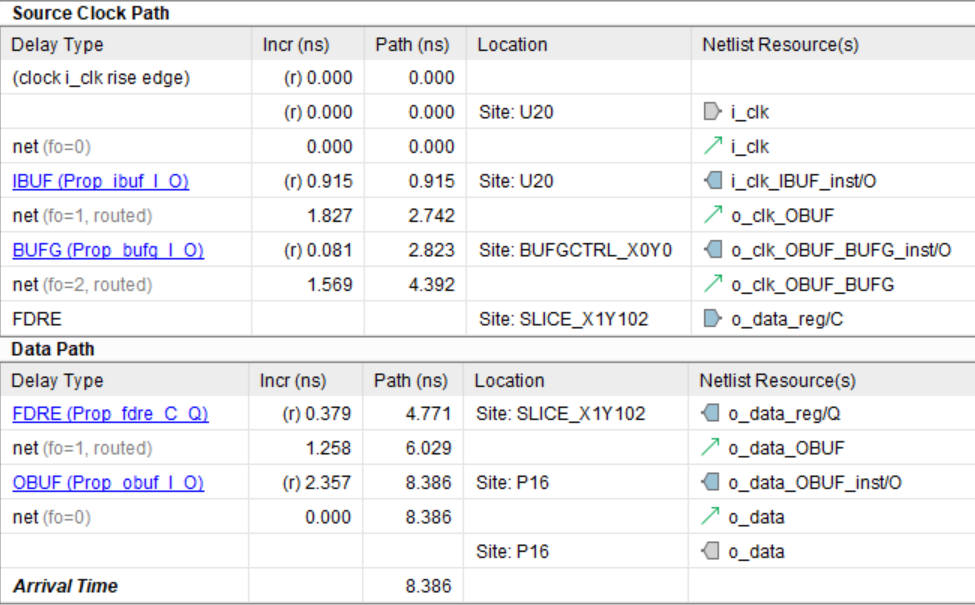Теперь осталось создать ограничения на максимальное и минимальное время распространения выходного сигнала o_data. Для этого воспользуемся формулами (6) и запишем в xdc-файл следующие команды:
