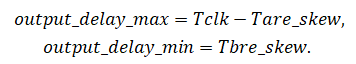 С помощью флагов -max и -min задаются минимальная (Tcbd_min) и максимальная (Tcbd_max) задержки распространения тактового сигнала от выхода FPGA до микросхемы LAN8740A. Так как эти задержки указываются отдельно, их нужно убрать из уравнений (6), которые теперь примут вид: