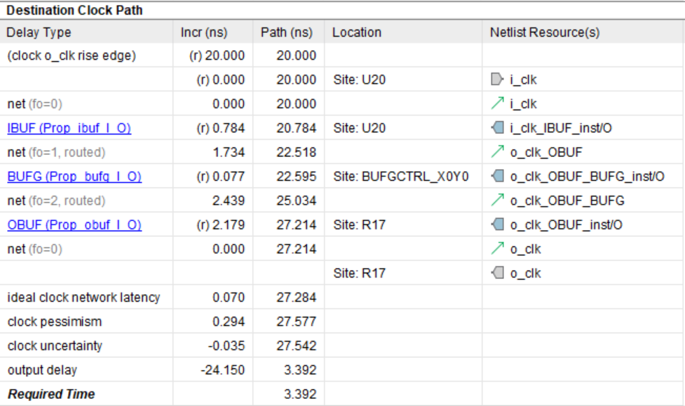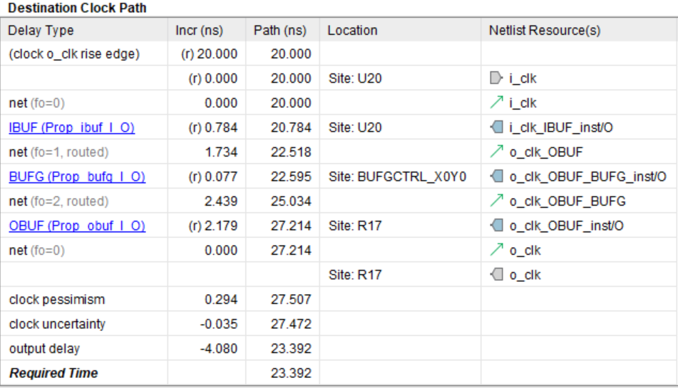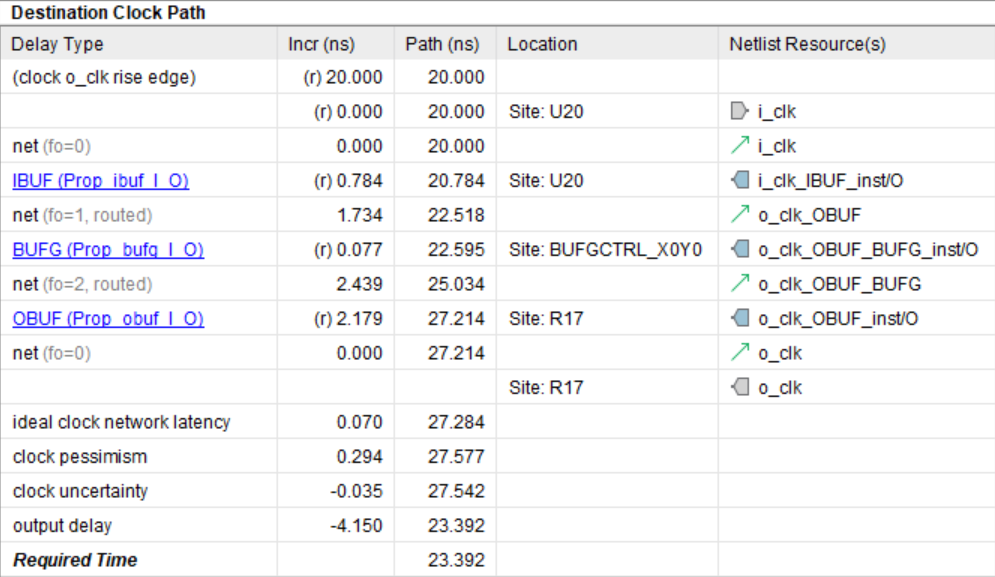 Как видно из рисунка 8, защелкивающий фронт o_clk формируется из фронта опорного сигнала i_clk, который появляется в момент времени 20 нс. Этот фронт распространяется через входной, тактовый и выходной буферы и появляется на ножке FPGA, когда время равно 27.214 нс.