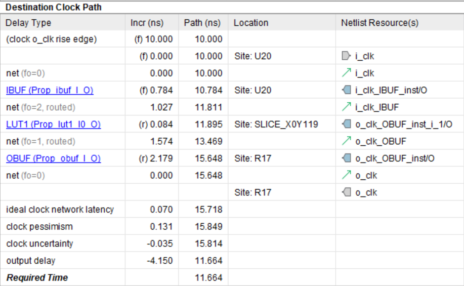 Рассмотрим один из возможных вариантов решения проблемы с нарушением временных ограничений из предыдущего раздела. Отрицательное значение Slack_setup указывает, что данные распространяются слишком медленно. Чтобы они успели достичь защелкивающего триггера, можно ввести дополнительную задержку для тактового сигнала. Для этого выполним инверсию сигнала i_clk перед его выдачей на выход FPGA.