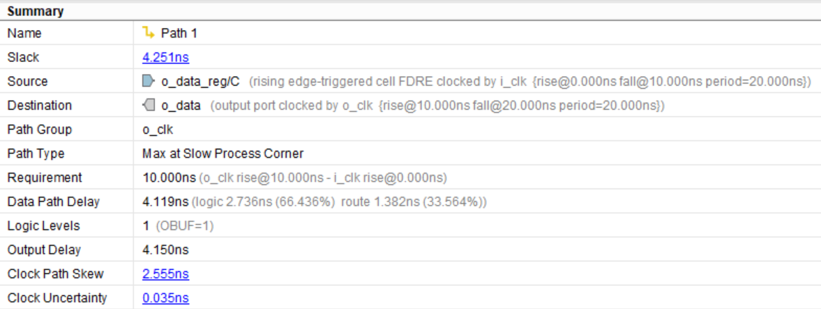 На рисунке 6 представлен раздел Summary временного отчета. Из строки с именем Source можно увидеть, что путь внутри FPGA начинается на входе триггера o_data_reg, при этом запускающим является тактовый сигнал i_clk. Строка Destination указывает, что данные выдаются через выходную ножку o_data и защелкиваются по сигналу o_clk. Положительное значение Slack, равное 10.763 нс, означает, что временные ограничения выполнены.