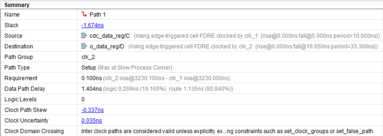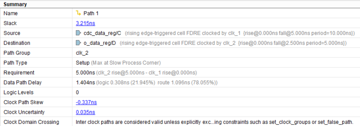 Можно увидеть, что для пути между доменами временной анализ проводится (Timed), но его результатам не следует доверять (unsafe). Причиной является асинхронность тактовых сигналов, так как они формируются из разных источников (No Common Clock).