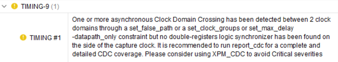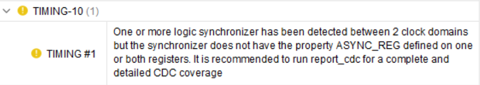 В нашем проекте есть путь, который пересекает тактовые домены и исключен из временного анализа с помощью команды set_false_path или set_clock_groups. Чтобы гарантировать правильность передачи между асинхронными доменами, данные должны проходить через специальные синхронизаторы, например, через сдвоенные триггеры (double-register logic). При формировании отчета о CDC Vivado просматривает netlist и пытается найти между доменами синхронизаторы. В случае их отсутствия выводится соответствующее замечание. Все структуры в netlist, которые Vivado распознает как синхронизаторы, можно посмотреть в [2] в главе 2.