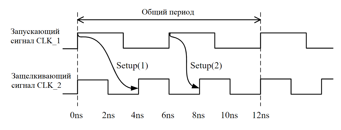 Для расчета ΔTsu временной анализатор поочередно выбирает один из фронтов сигнала CLK_1 и рассматривает его в качестве запускающего. То есть, проверяются случаи, когда запускающий фронт формируется в момент времени 0 нс, 6 нс, 12 нс и так далее. Затем для каждого запускающего фронта CLK_1 находится соответствующий защелкивающий фронт сигнала CLK_2. При этом ищется ближайший фронт CLK_2, который появляется строго после запускающего фронта CLK_1.