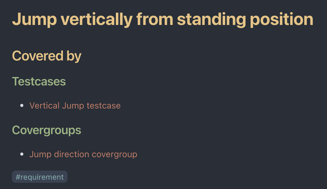 Всё красным шрифтов это ссылка на другую страницу. Таблица формируется автоматически, а связь между требованиями, тестами и группами указывается на странице описания требования. Страницы тестов и групп содержат информацию о своём состоянии.