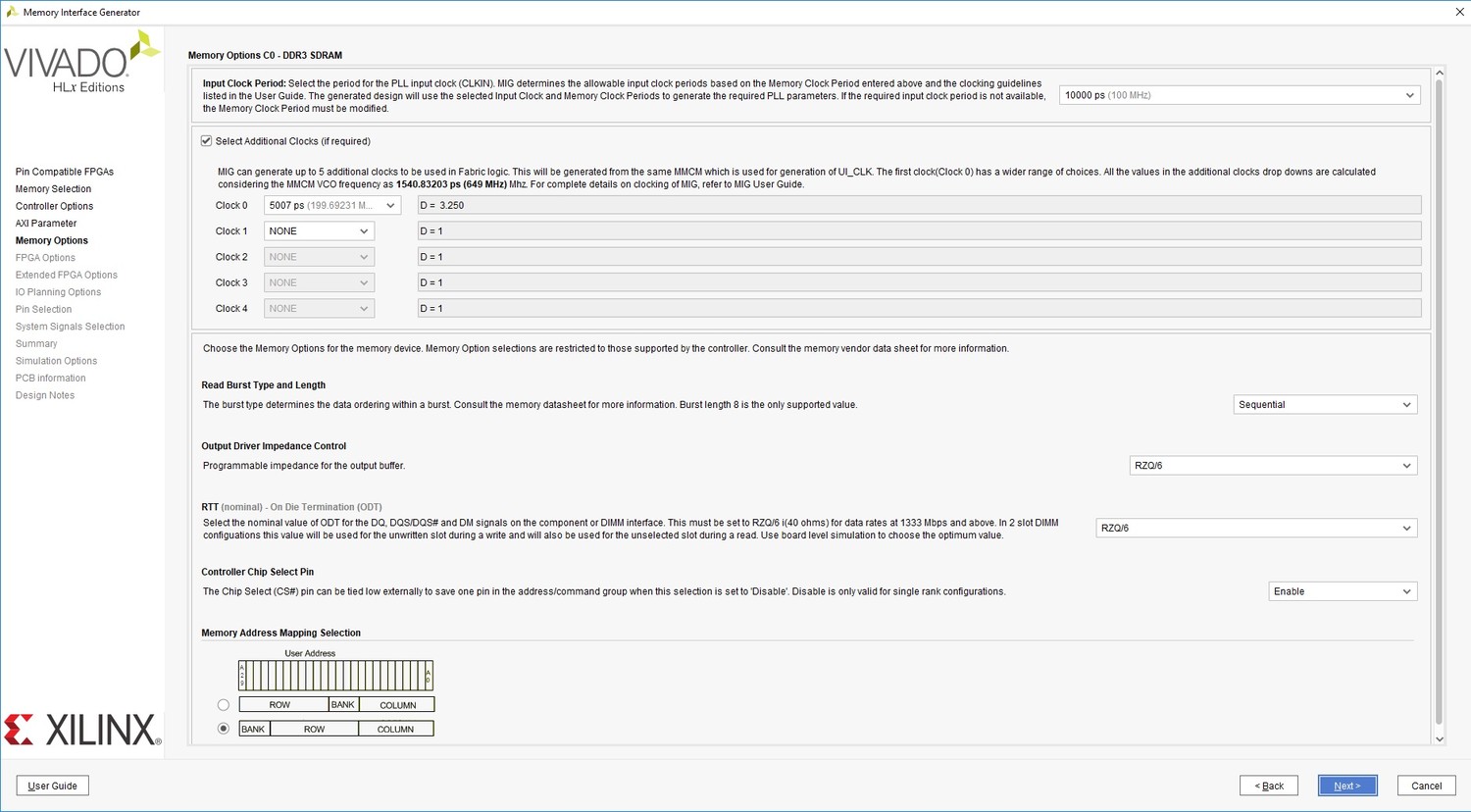 Burst Type and Length настраивает тип пакетных передач. Для DDR3 и DDR2 длина может быть только 8. Output Driver Impedance Control и ODT выставим в соответствии с настройками Digilent’a. При настройке другой платы выходной импеданс нужно искать в документации. Остальные настройки оставим по умолчанию и перейдем на вкладку FPGA Options (рисунок 12).