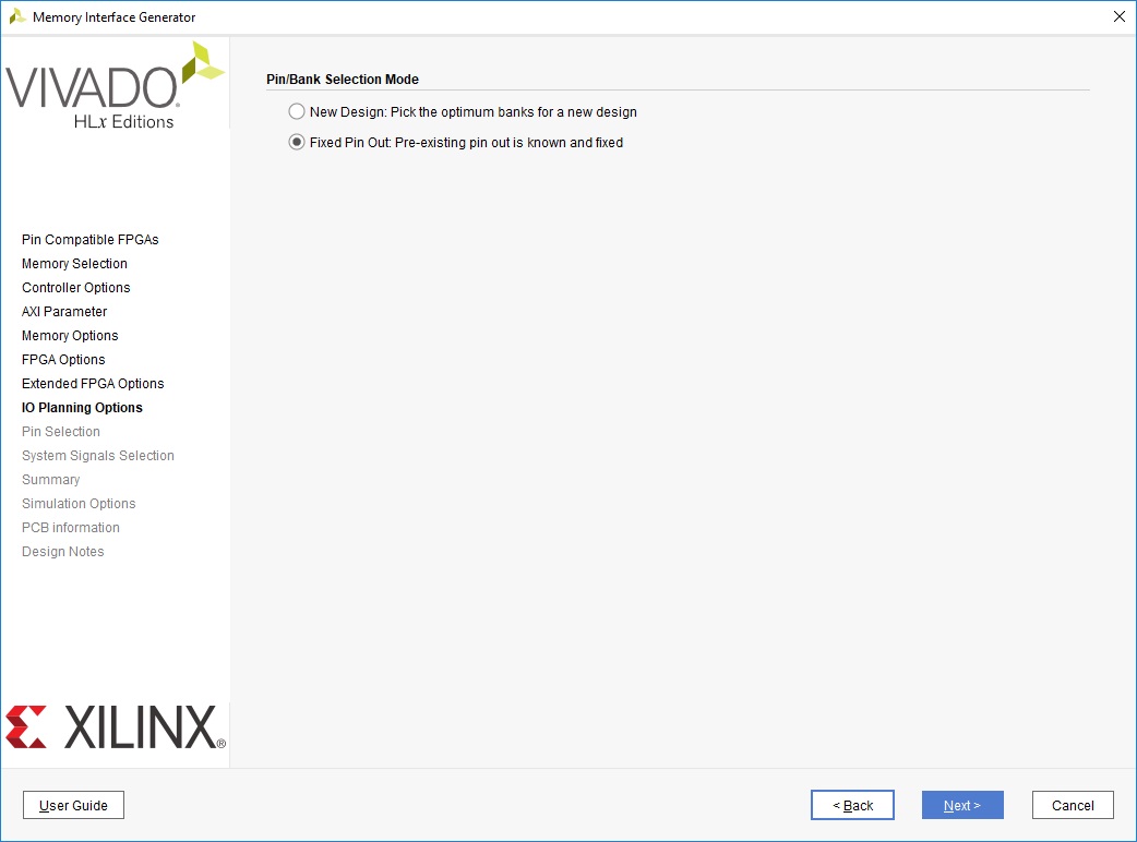 От выбора на этой вкладке зависит то, как будут назначены сигналы для памяти. Если ядро генерируется для нового проекта, то можно зарезервировать выводы в соответствии с группами байт. Мы же воспользуемся вторым вариантом, так как наши пины уже известны заранее. На следующей вкладке Pin Selection увидим следующую картинку (рисунок 14):