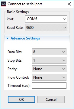 Теперь добавим и запустим SDK Terminal со следующими настройками, исключая номер COM-порта, так как он у вас может быть любым другим (рисунок 29):