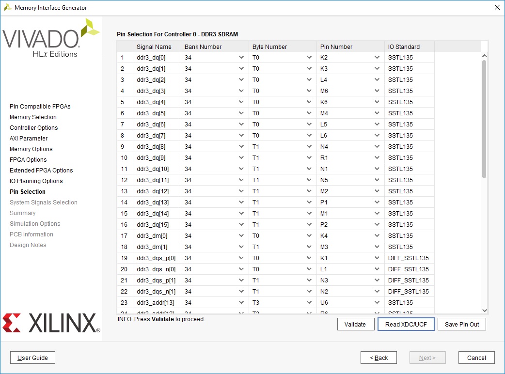 Воспользуемся констрейнами от Digilent’a, нажав кнопку Read XDC/UCFи выбрав соответствующий файл из репозитория. Для каждого сигнала должны обновиться номера выводов и их стандарты. Нажимаем на кнопку Validate и, если все нормально, переходим к следующей вкладке (рисунок 15).
